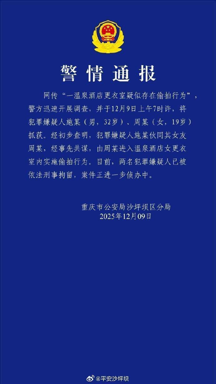 12月9日,重庆市公安局沙坪坝分局发布警情通报:网传“一温泉酒店更衣室疑似存在偷拍行为”,警方迅速开展调查,并于12月9日上午7时许,将犯罪嫌疑人施某(男,32岁)、周某(女,19岁)抓获。