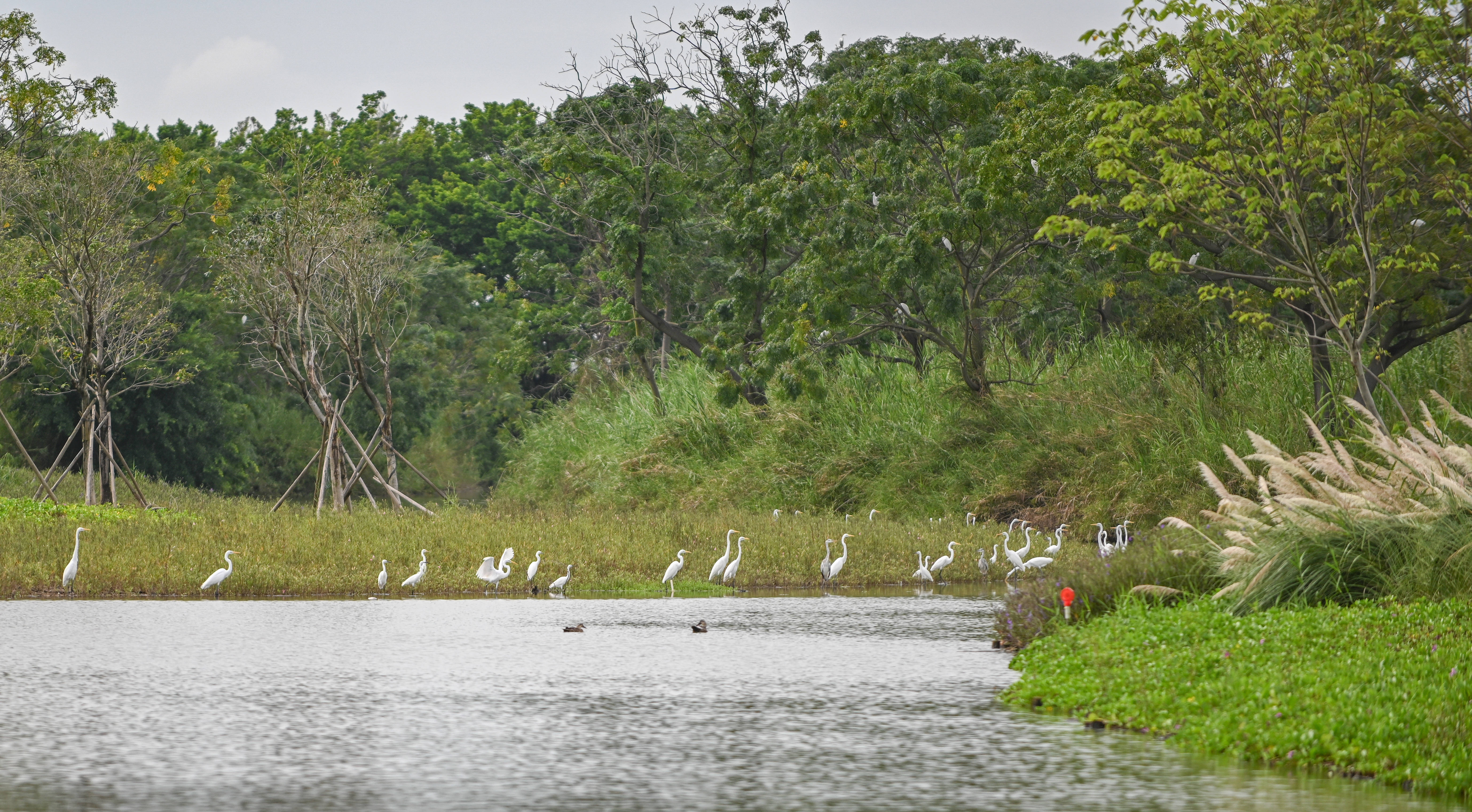 作为广州市面积最大的滨海红树林湿地,南沙湿地根据鸟类习性进行了内部功能分区。“饭堂区”有上千亩低水位滩涂,候鸟季水深维持在10公分左右,便于鸟类从容觅食;“筑巢区”内的红树林枝叶茂密,平均高度超过20米,可有效防范天敌侵扰,为鸟类提供安全的栖息环境;“游玩区”则种植了秋茄、木榄、水黄皮、海芒果、桐花树等生长速度较慢的矮树林,成为鸟类嬉戏游玩的天然乐园。
